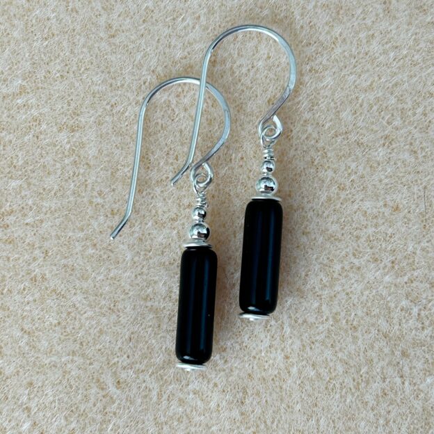 Sterling silver with black Obsidian tube stone earrings. The component measures 7/8″ long and 3/16″ at the widest point. Check my web store for purchasing details”